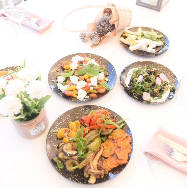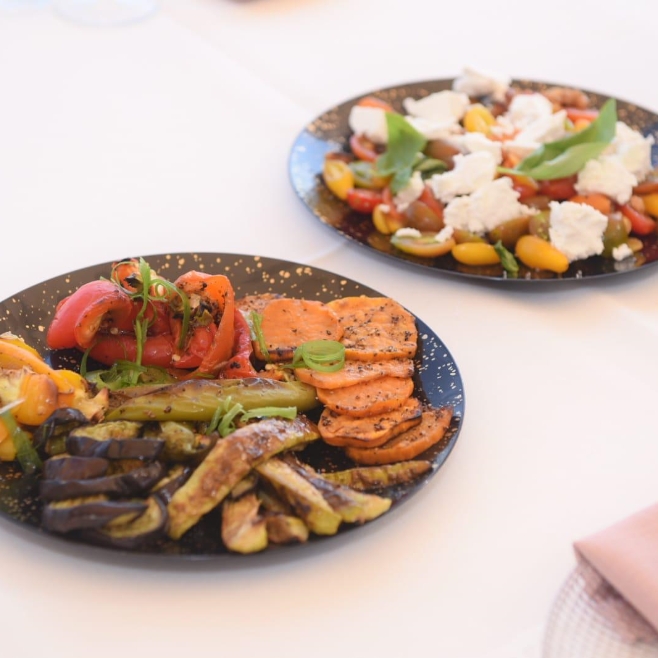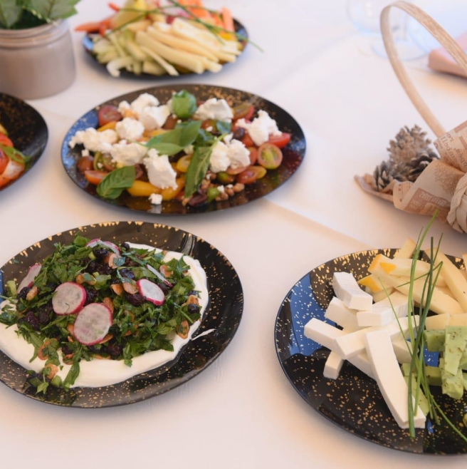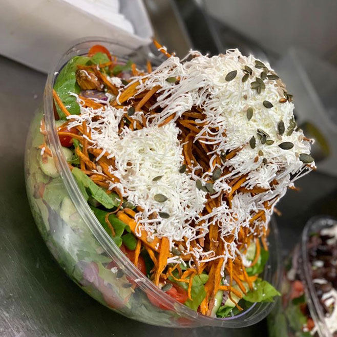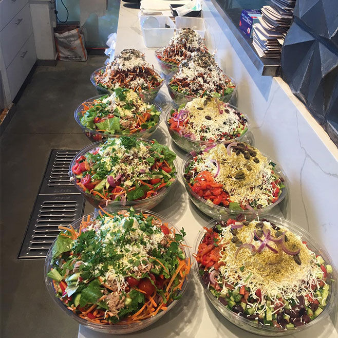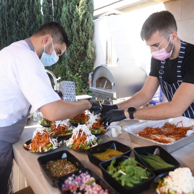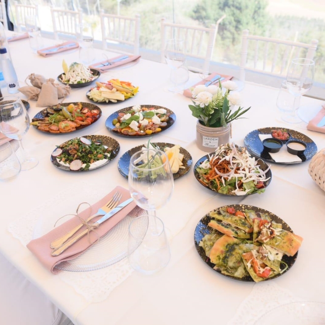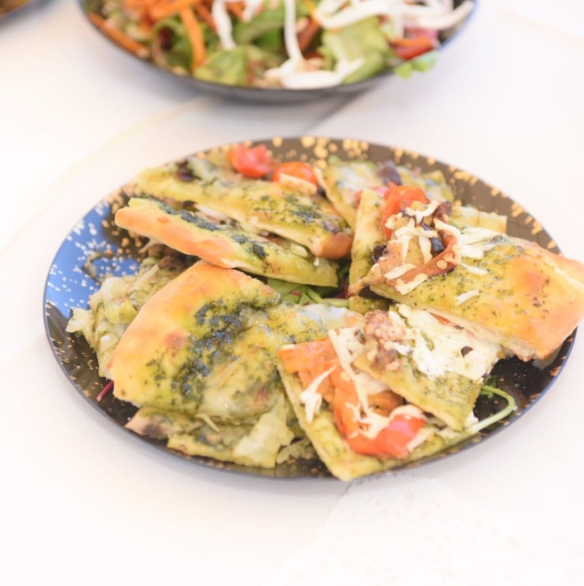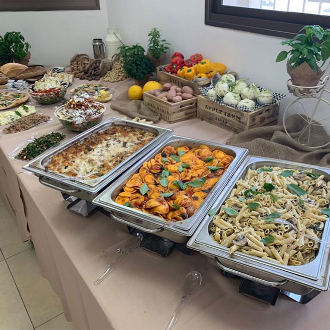 מבחר פיצות, סלטים, פוקאצ’ות ופסטות עשירות המגיעים בכלי אירוח ארוזים